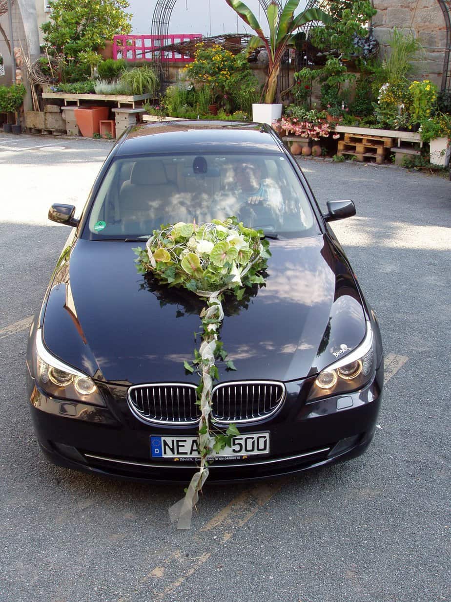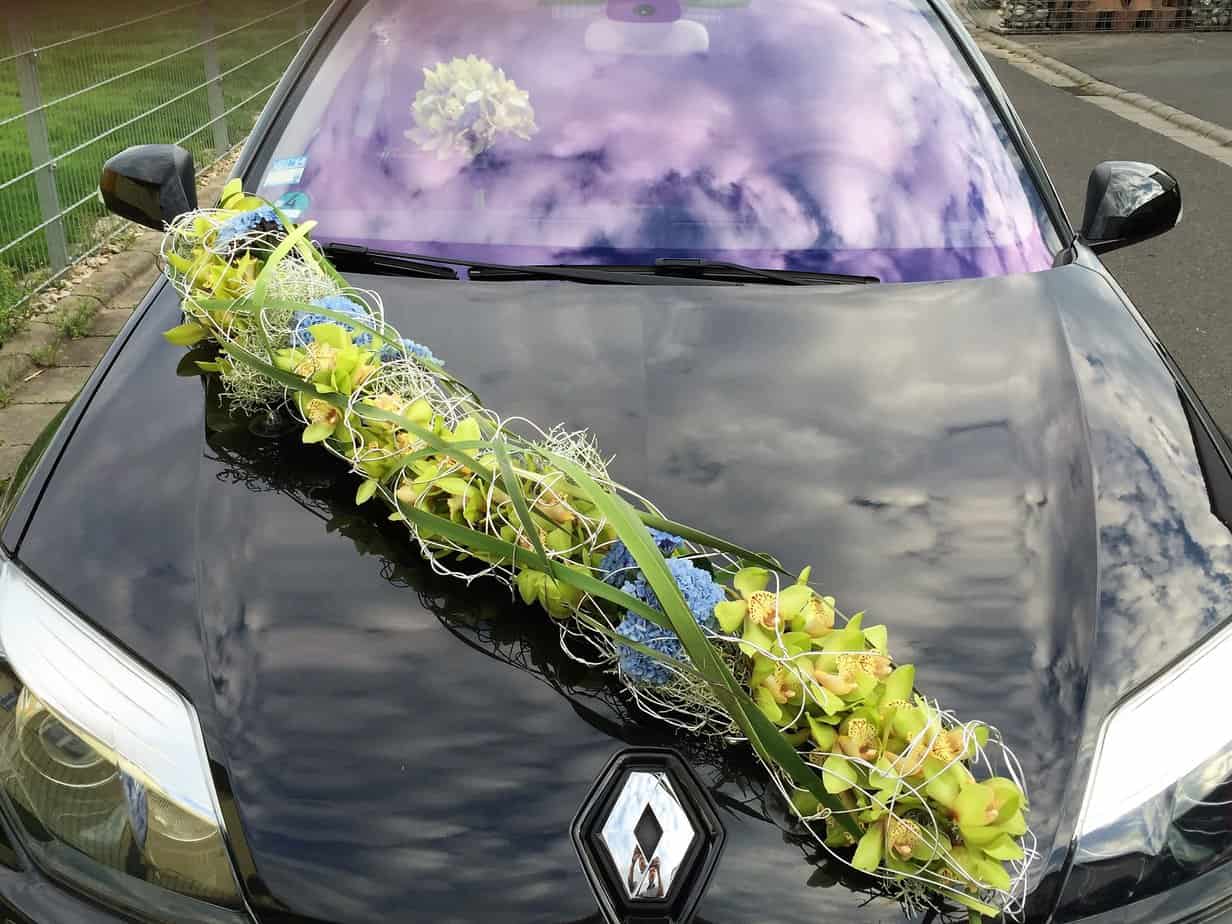 Auffallender Autoschmuck für ein auffallendes Fahrzeug. Vintagefarbene Blumenauswahl arrangiert in ein roséf. Aludrahtkissen