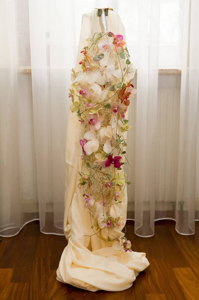 2,50m lange Brautschleppe aus vielen, vielen Einzelblüten, Pepta-Rosen, Hortensienblüten, Bouganvillea-Blüten, Clematisfruchtstände und Rhodochitonranken